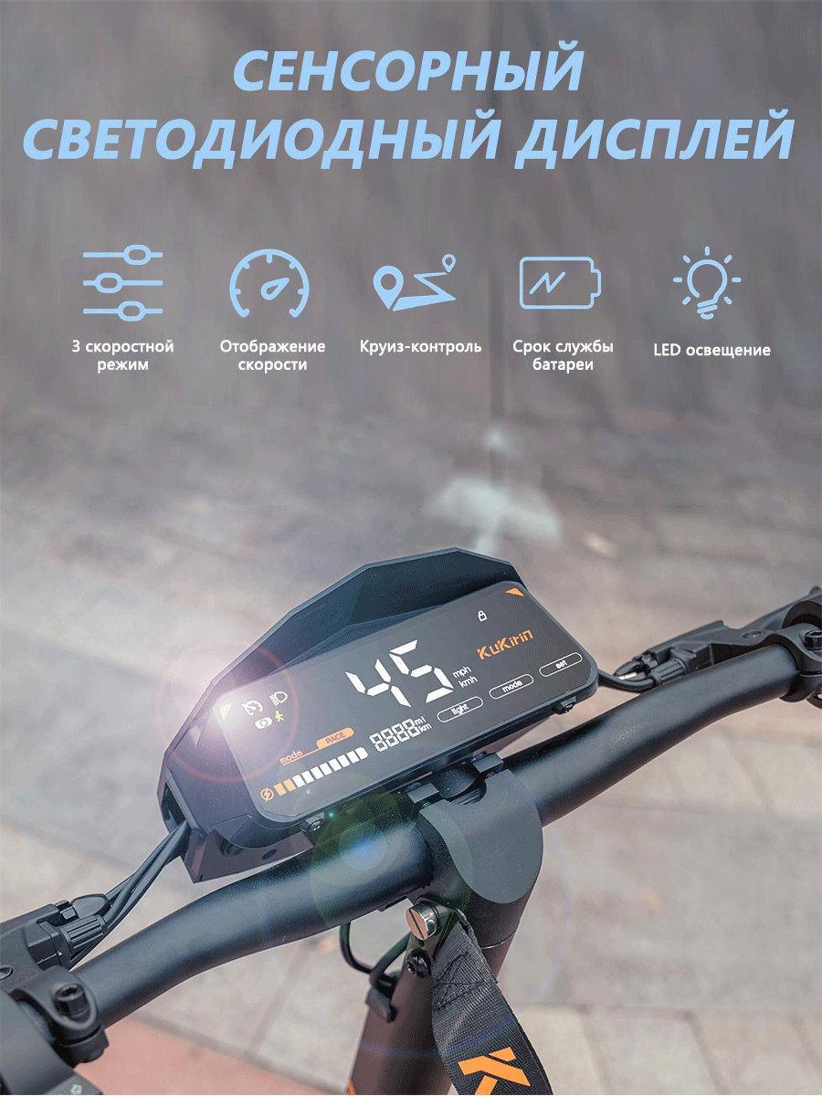 Бесщеточный электродвигатель имеет номинальную мощность 800 Вт и пиковую 1200 Вт, что обеспечивает резвый разгон и уверенное преодоление подъемов до 20 градусов. Аккумуляторная батарея напряжением 48 В и емкостью 15600 мА·ч питает двигатель и обеспечивает запас хода до 55 км на одном заряде. Максимальная скорость достигает 45 км/ч, позволяя динамично передвигаться в городском потоке.