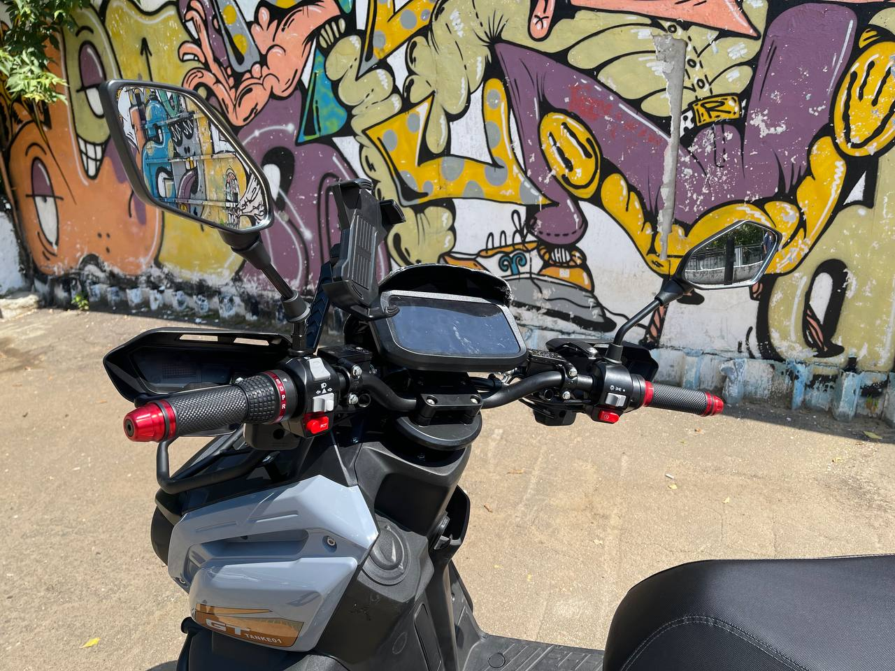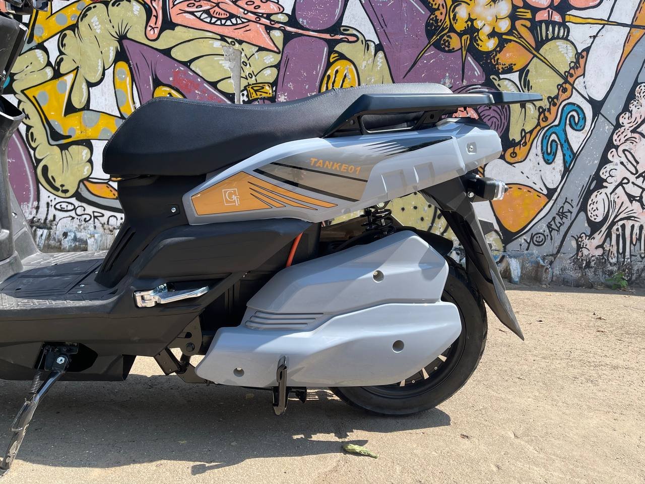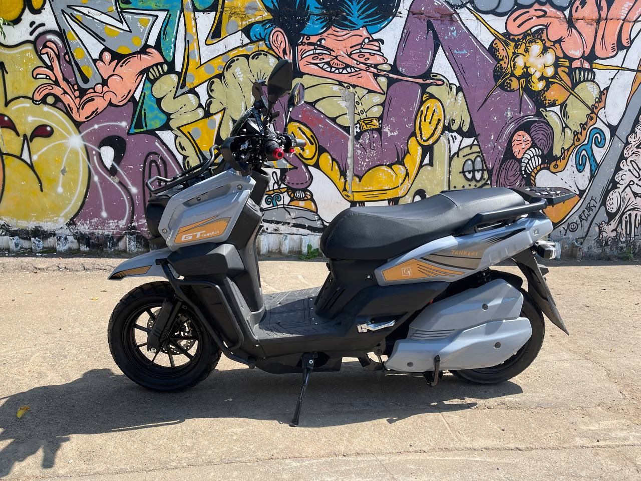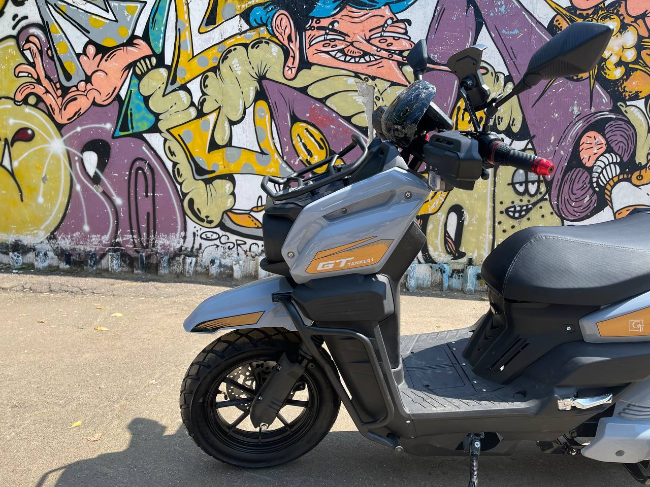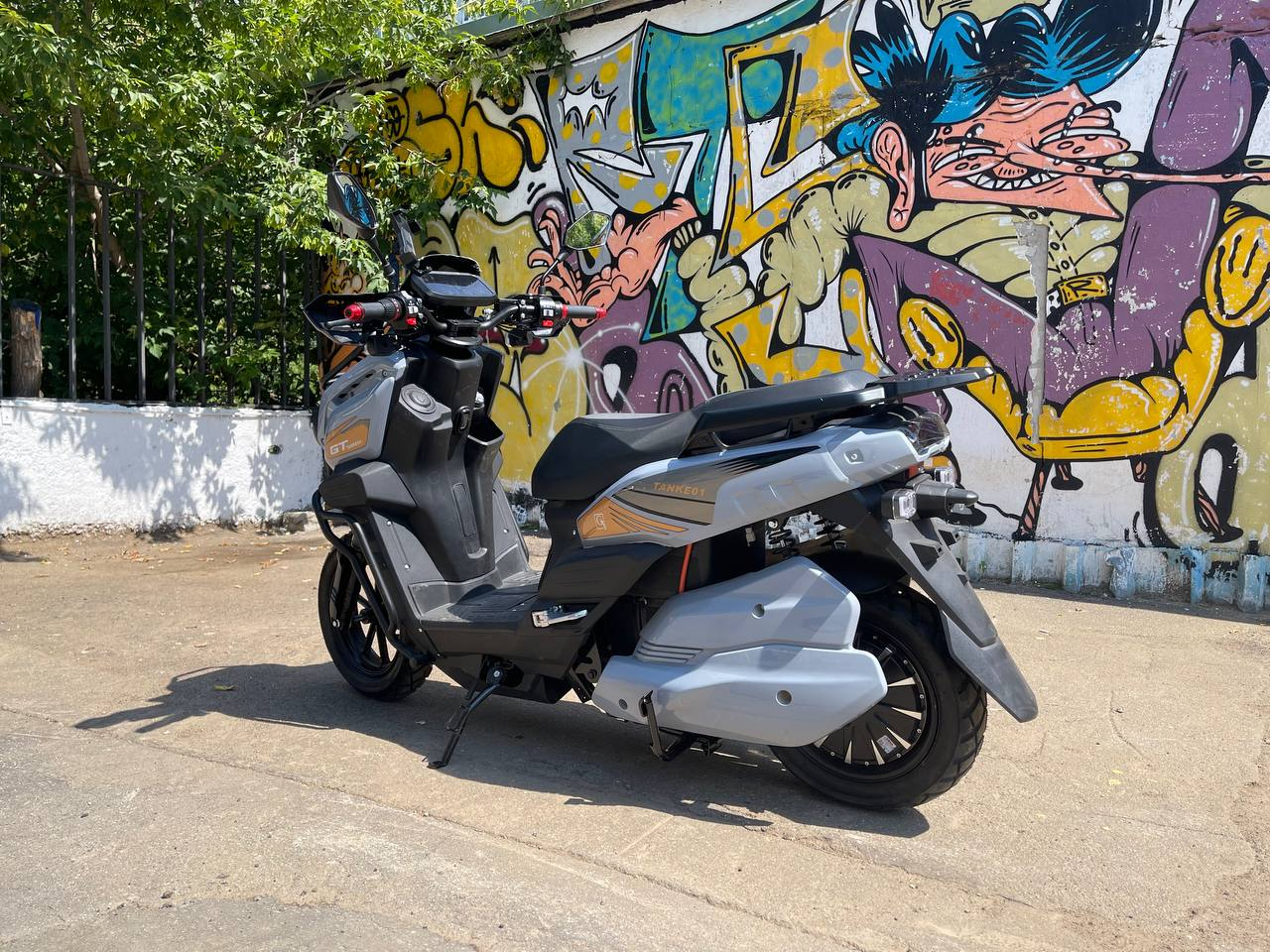 Впечатляющая передняя часть с двумя круглыми фарами, обрамленными защитными элементами, придает скутеру агрессивный и технологичный вид. Насыщенные оттенки и графические элементы с логотипом "TANK" делают этот скутер заметным и подчеркивают его спортивный характер.